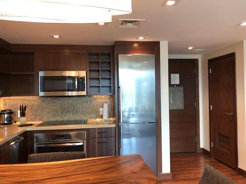 ドアを入ると右手にキッチンがあります。カウンター式です。大型冷蔵庫、電子レンジ、4つ口コンロ、オーブン、食洗器があります。シンクにはディスポーザーがついていますので、生ごみの心配はありません。その他のごみは中日(なかび)1回のハウスキーピングの時に片づけてくれます。