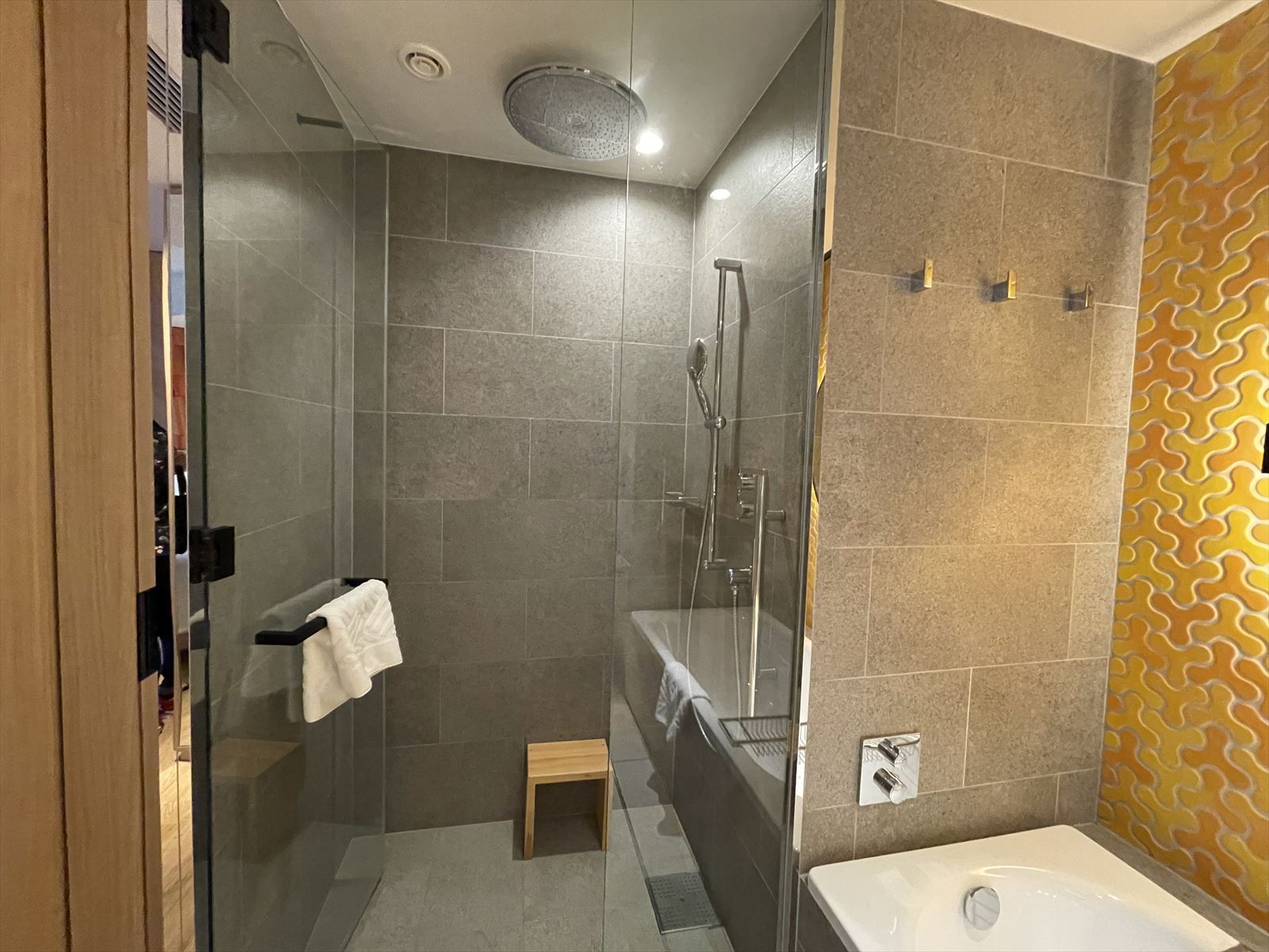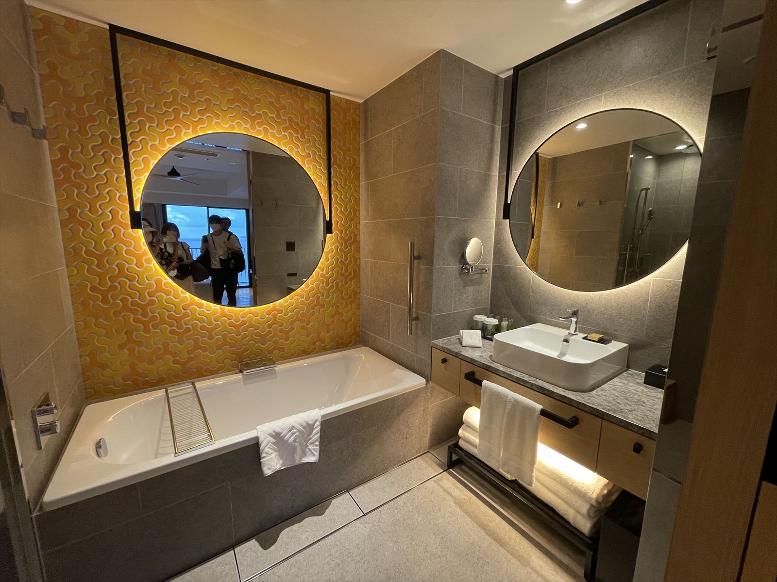 ベットルーム横に洗面台、バスタブ、シャワーブースとコの字に配列されています。