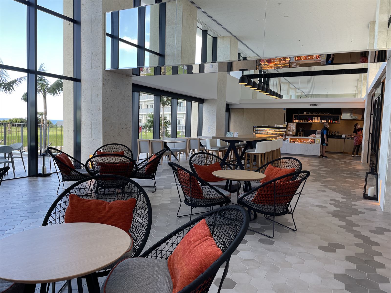 入り口を入ると、まず正面に見えるオブジェ。その向こうにはプールと瀬底の青い空が広がります。