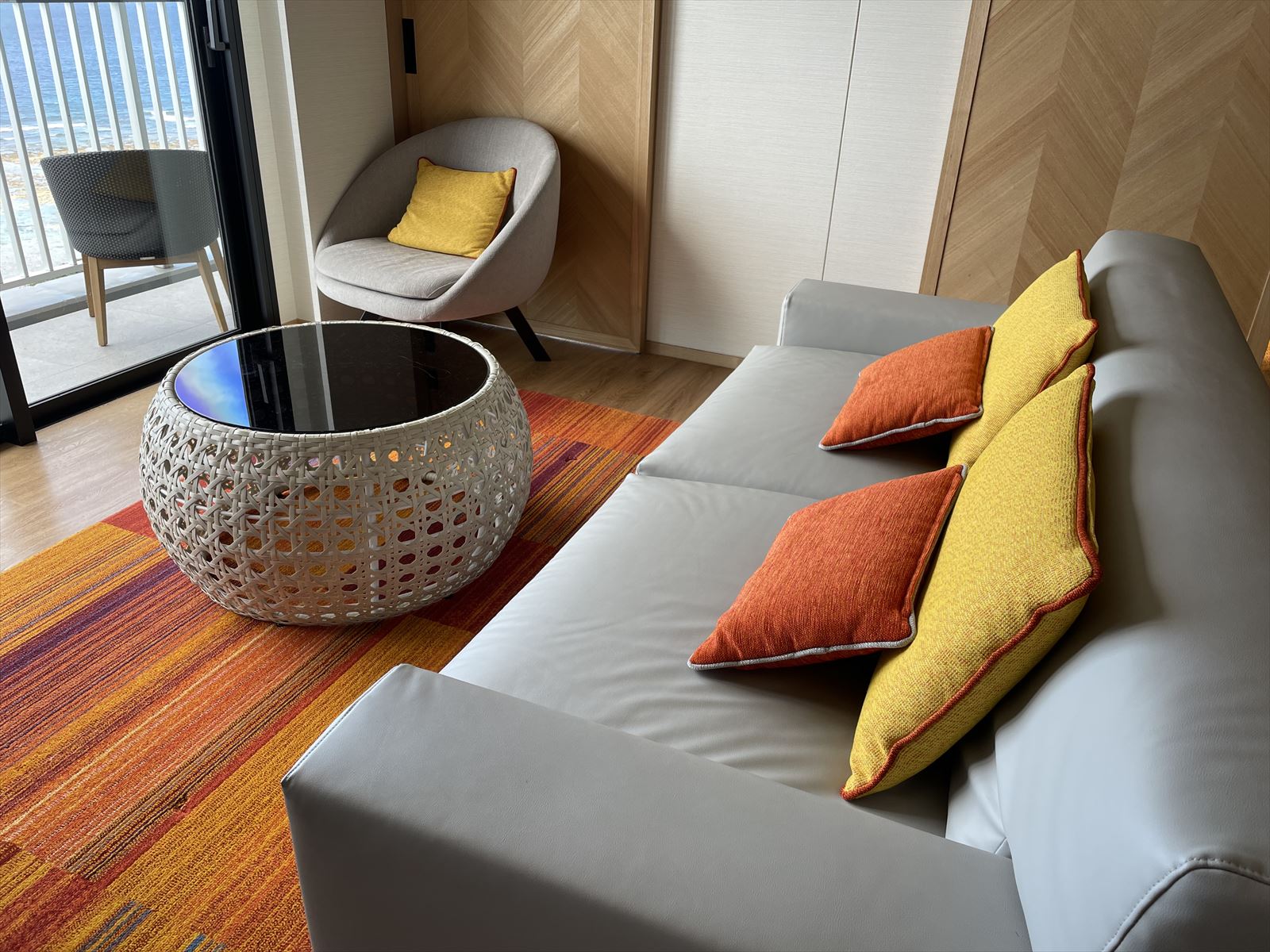 ダイニングテーブルの奥にはベットにもなるソファー。ゆっくり海を眺めることができます。
