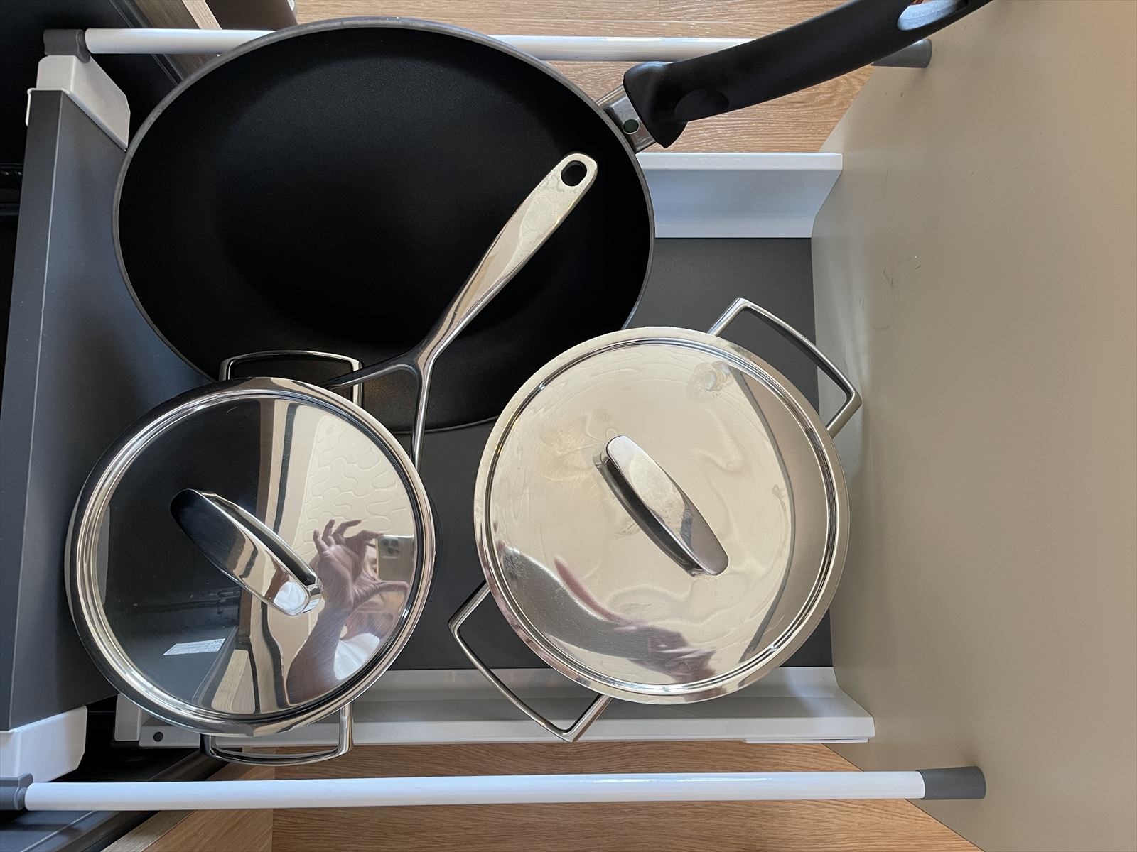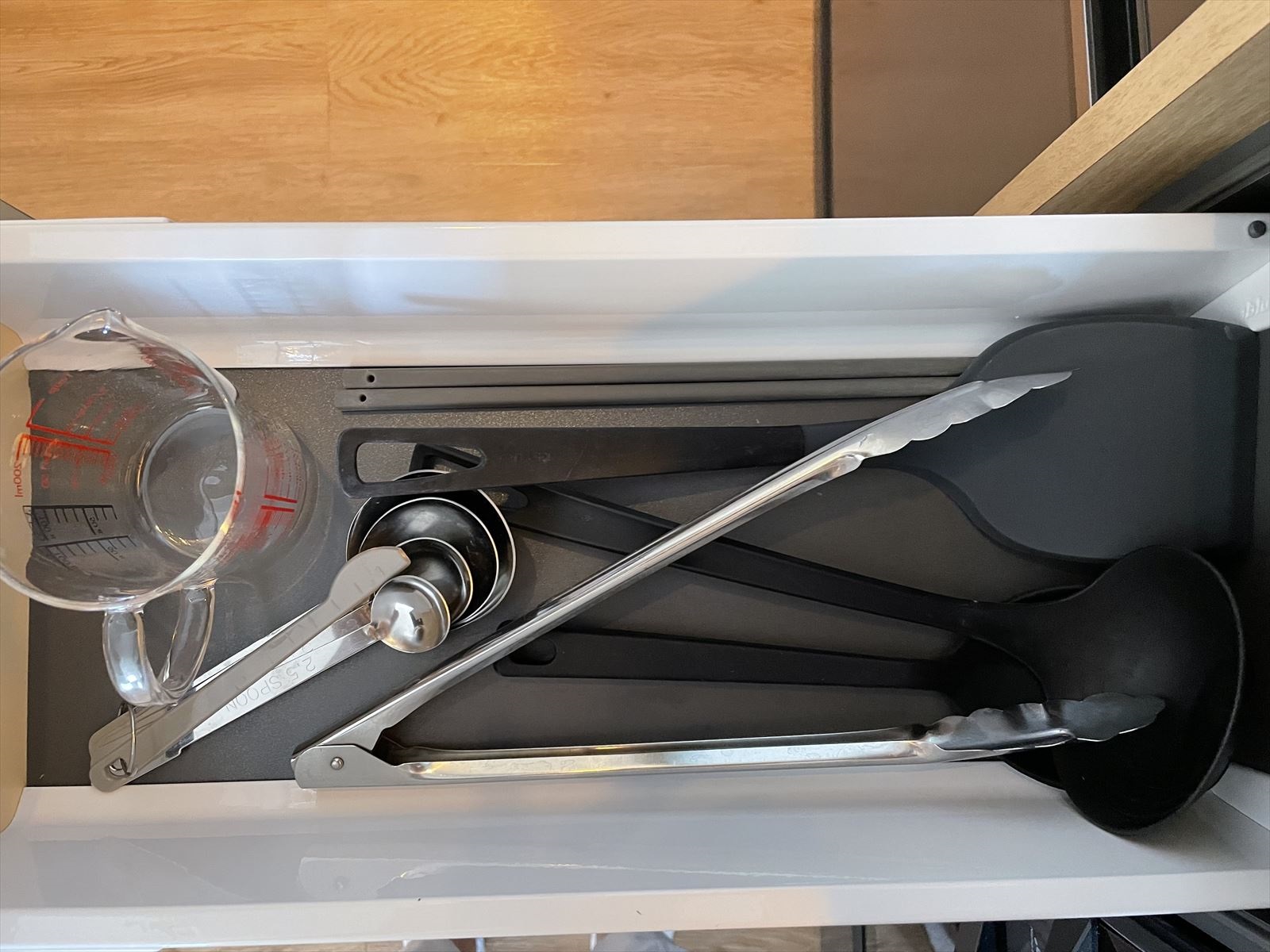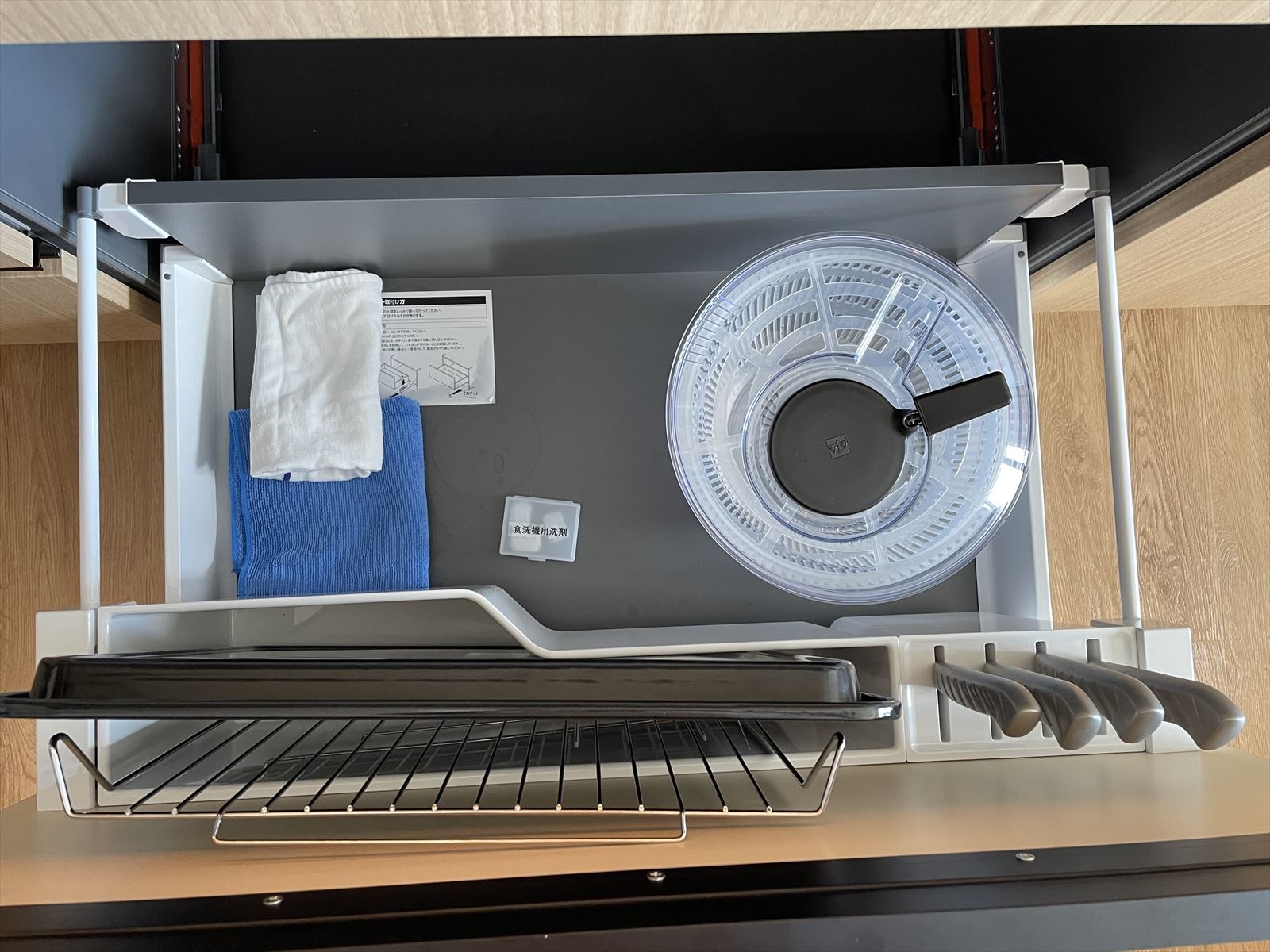 キッチンの上部扉を開けると、食器が入っています。引っ張ると棚部分が下に降りるタイプです。