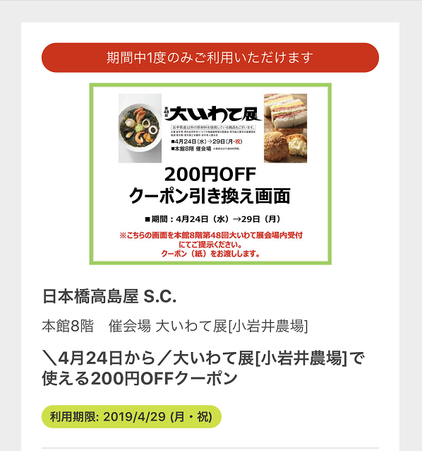 ・各店の催しは、「Takashimaya Salno」というゴールドカード以上の会員向けに送られてくる冊子のまとめて紹介されています。また、高島屋アプリでも確認できます。アプリには催しの時に使えるクーポンが送られてきて、会場で利用することができます。