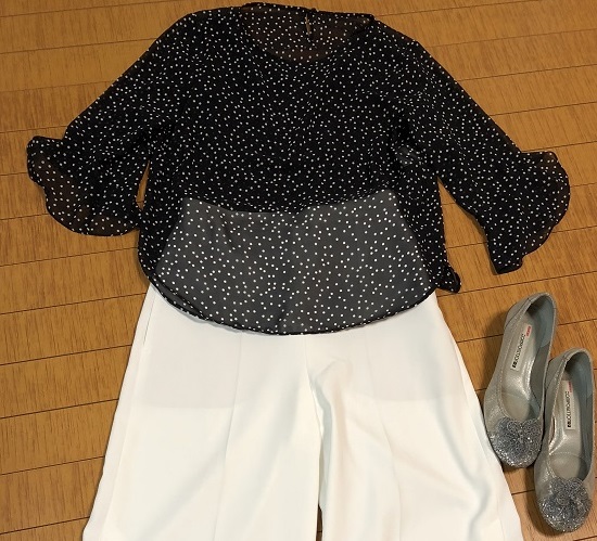 ポルカドットブラウス+ガウチョパンツ+フラットシューズ