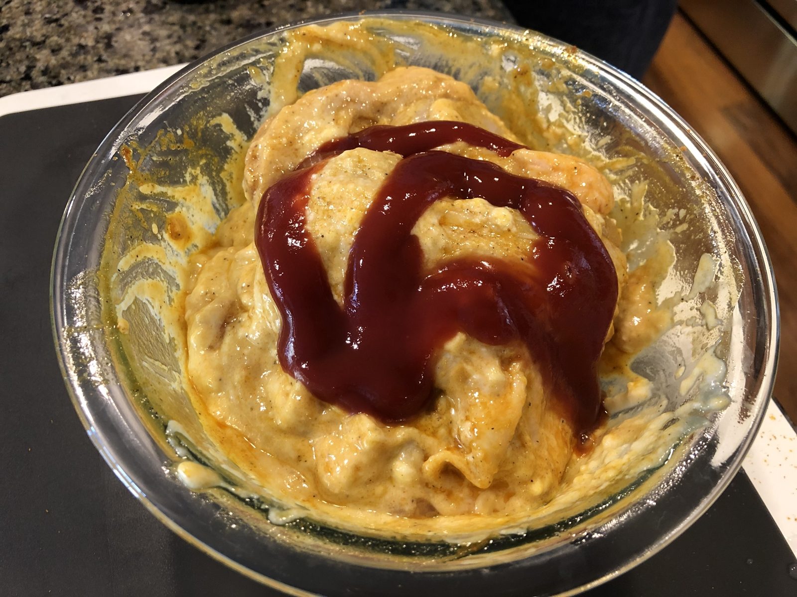 ②さらにケチャップを入れて、よく混ぜ合わせ味が染みるまで置いておきます。今回は1時間位で調理しましたが、もっと長く置けばさらに味が染みます。長時間置く場合は冷蔵庫で保管してください。