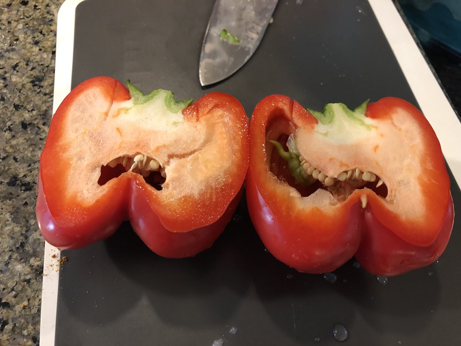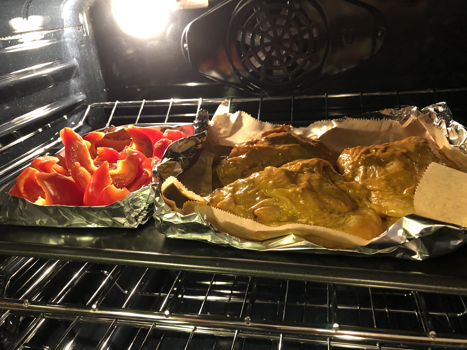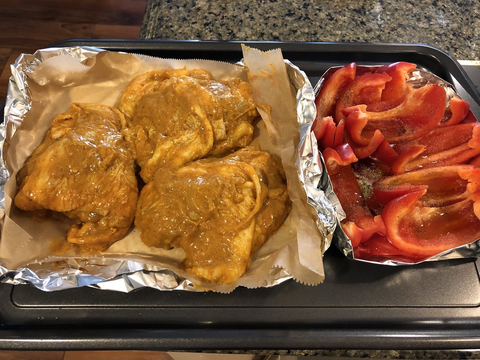 ⑤余熱が終わったら、ヨーグルトに漬けておいた鶏もも肉をオーブンの付属のトレイにのせて焼きます。鶏もも肉の大きさにもよりますが、30分位焼きます。途中で焦げてくる場合はオーブンの温度を少し下げて様子をみます。パプリカは焼きあがったら取り出しておきます。