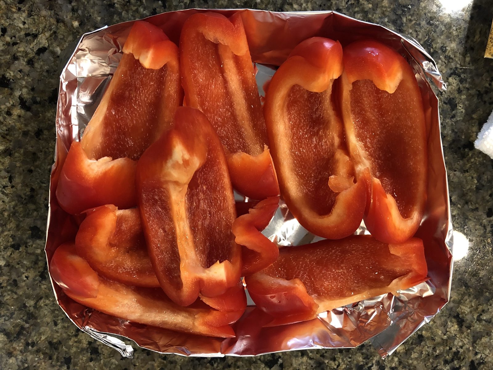 ③付け合わせのパプリカを8等分に切り、アルミホイルで作った簡易皿に入れておきます。
