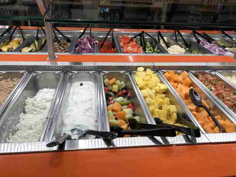ホールフーズといえば、テイクアウトできる量り売りのお惣菜ですが、これも、種類が多く迷ってしまいます。ここで買ったものは、入り口横のテラスや2階で食べることができます。