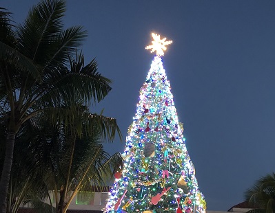 ハロウィンが終わると、街はクリスマスの装いに変わります。12月にハワイに来ると、ホテルのロビーやTギャラリアの入り口、あちらこちらにクリスマスデコレーションが施されています。一方、ビーチに足を延ばせば青い海とヤシの木がそよぐ風景は、12月ということを忘れてしまいそうです。