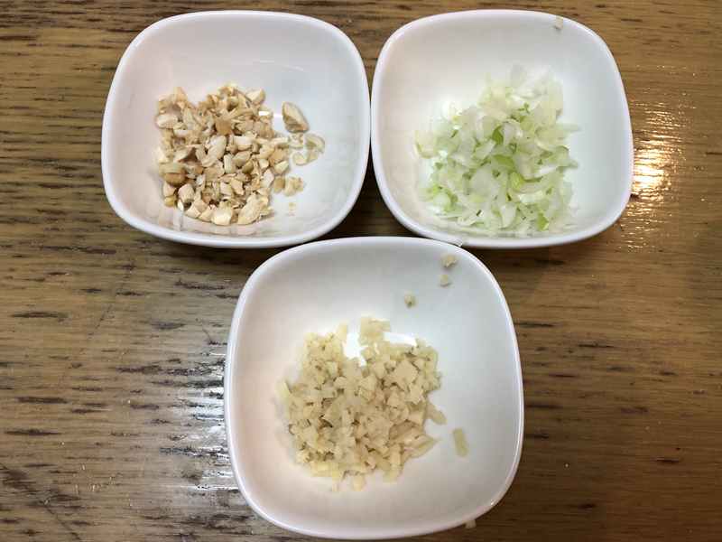 (ソース)醤油大さじ2 ごま油大さじ1 酢大さじ2 刻みネギ大さじ1 刻んだカシューナッツ 大さじ1 ラー油適宜