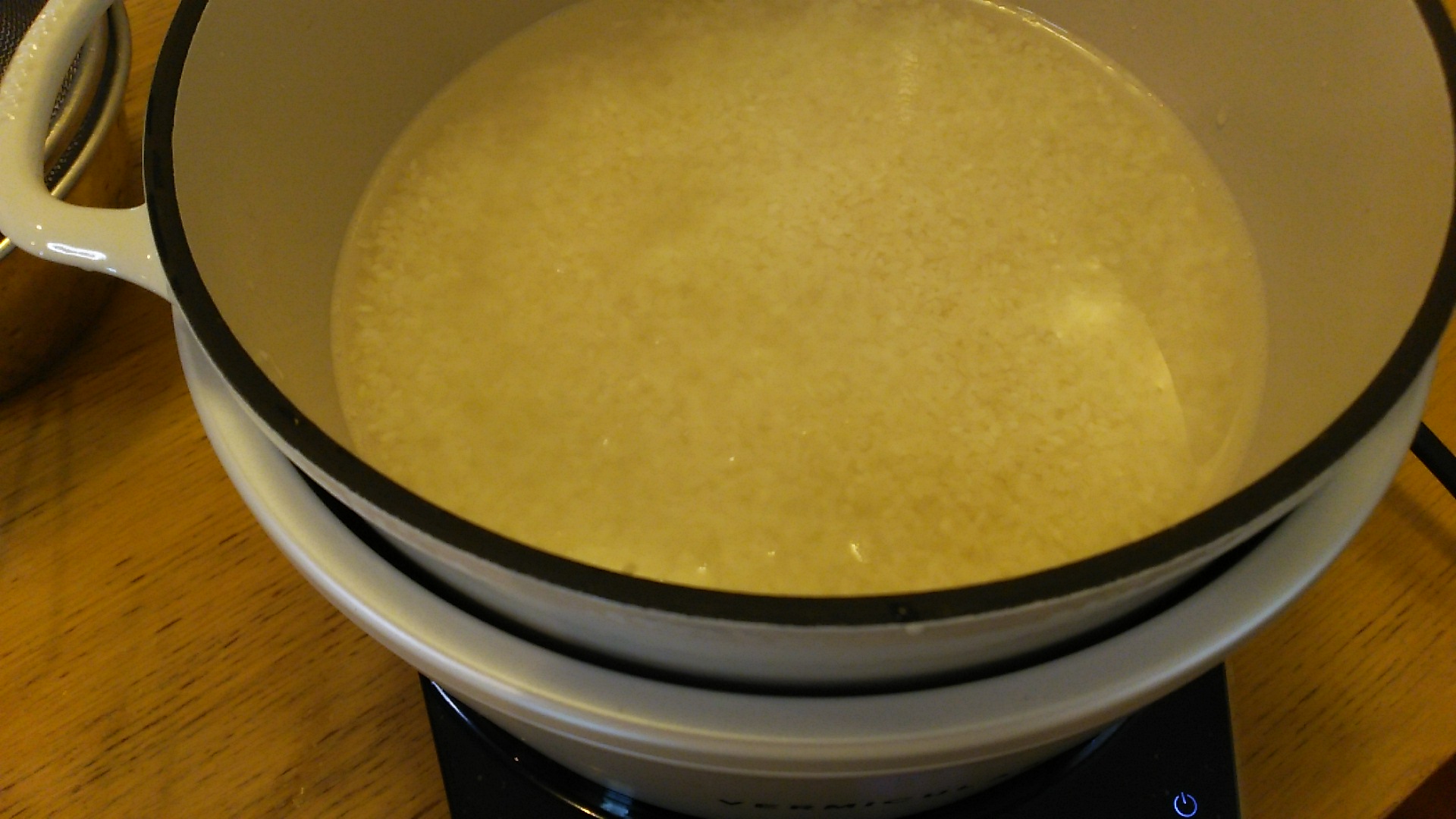 鍋自体がとても重いので、別にボールとざるを準備し、米を研ぎます。説明書には3回と書いてあり、研ぐというより、ゆすぐという感じです。