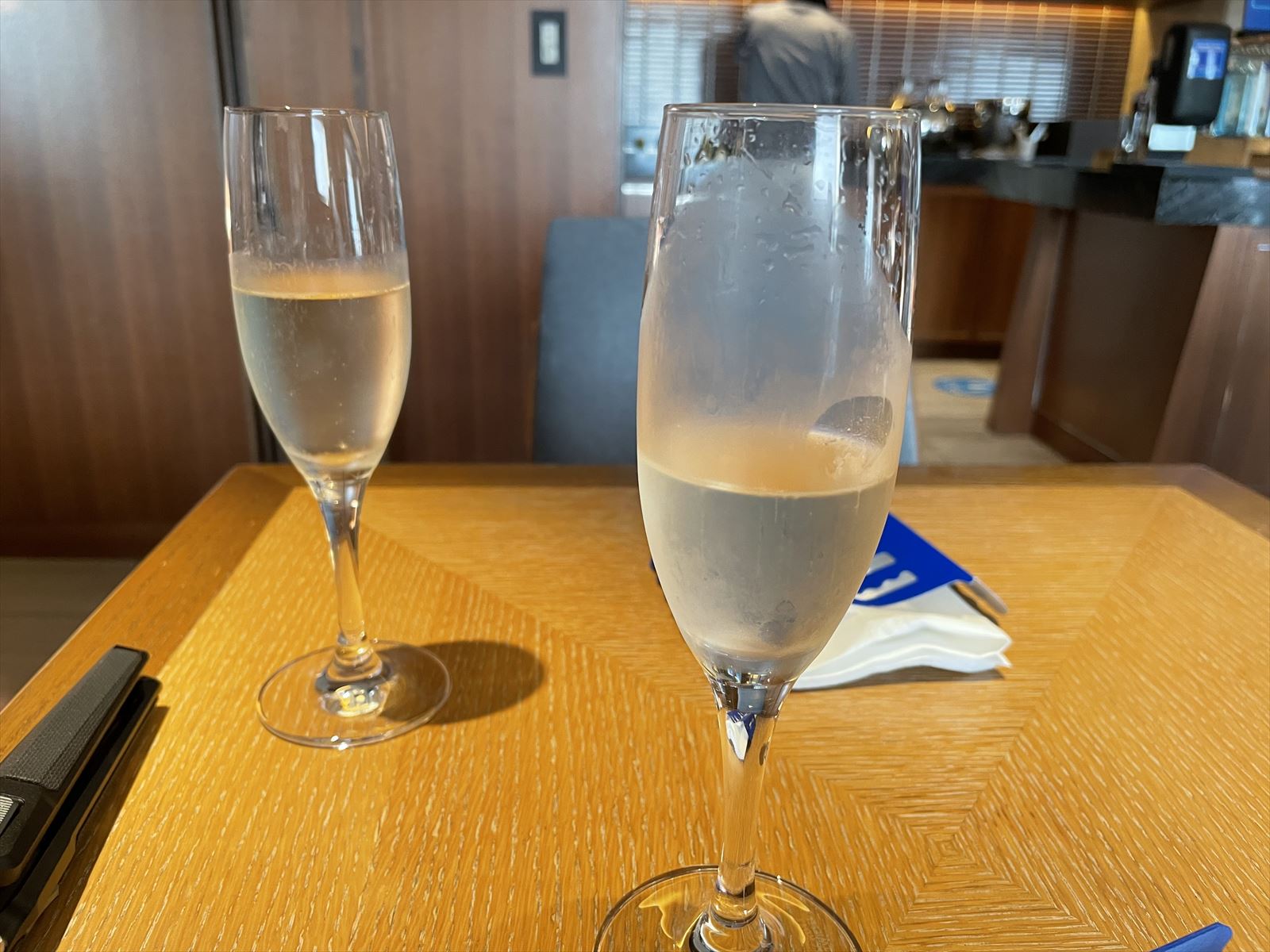 アフタヌーンティーでは、アイスコーヒーとチョコプリン、オットはアイスティーとコーヒーゼリーをいただきました。夕方からのカクテルタイムではスパークリンワインやハイボールをいただきました。
