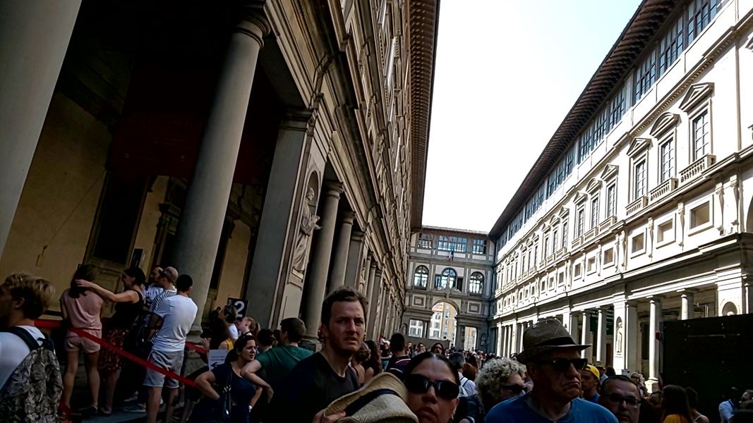 フィレンツェの中央駅に着くと、大勢の観光客が同じ方向に歩いていくのでついていきました。しばらく歩くとドゥオモに着きました。ドゥオモからは、400~500m歩くとシニョリーア広場にでます。ウッフィッツ美術館の建物も見えます。チケット購入場所は、建物の中間位の位置になります。大勢の人で通路もいっぱいですが、表示があるので迷わないで行けると思います。