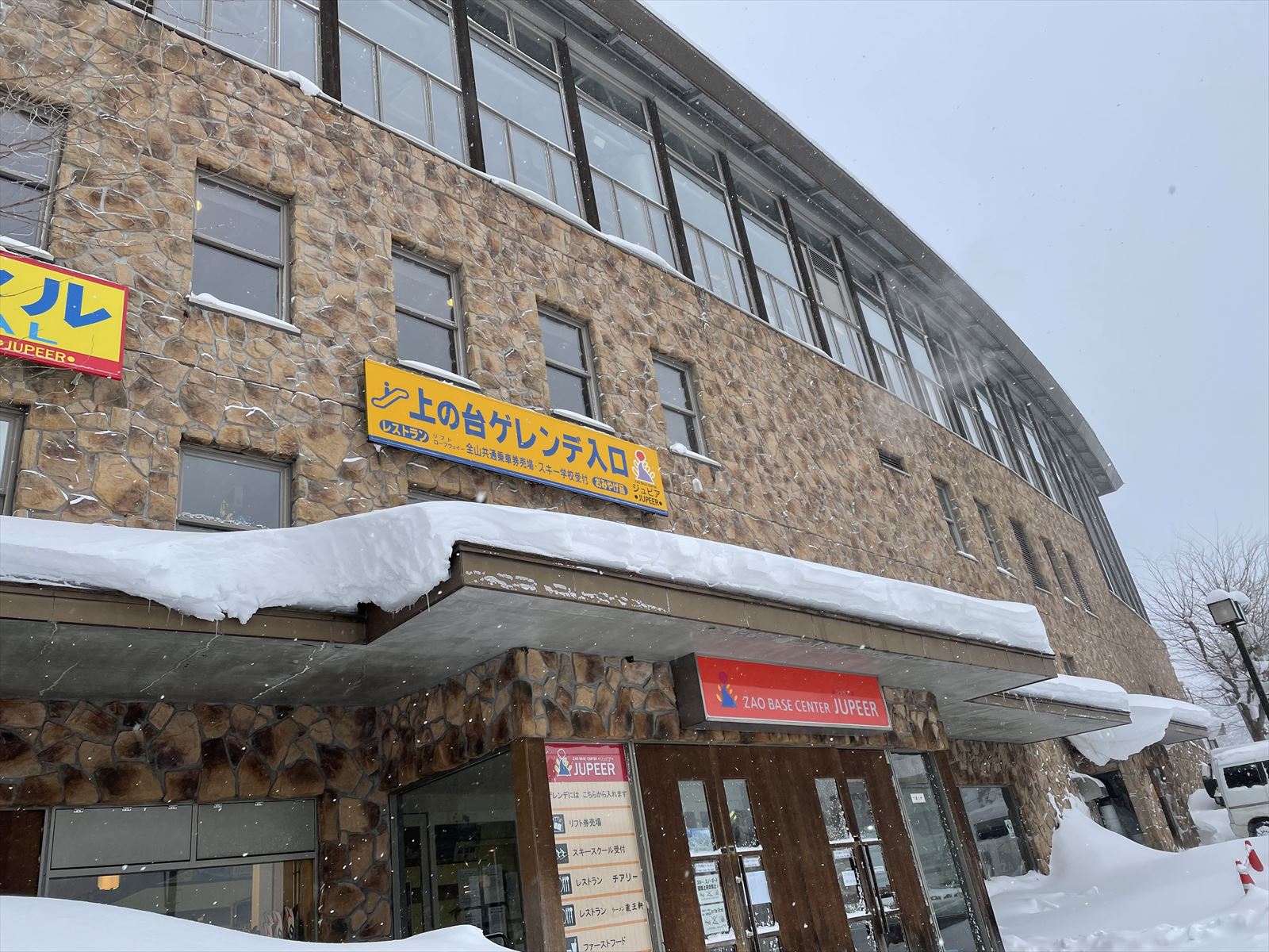 当然、蔵王温泉BTにはスキーセンター的なものはなく、ただのバス乗り場でした。そこからスキー場までは徒歩しかありません。事前に調べたら約700m、10分と出ていたのですが、これは雪のない時の話。実際には雪道の上、坂道、ウエアなどの入った大きなバックを持っての移動は大変でした。