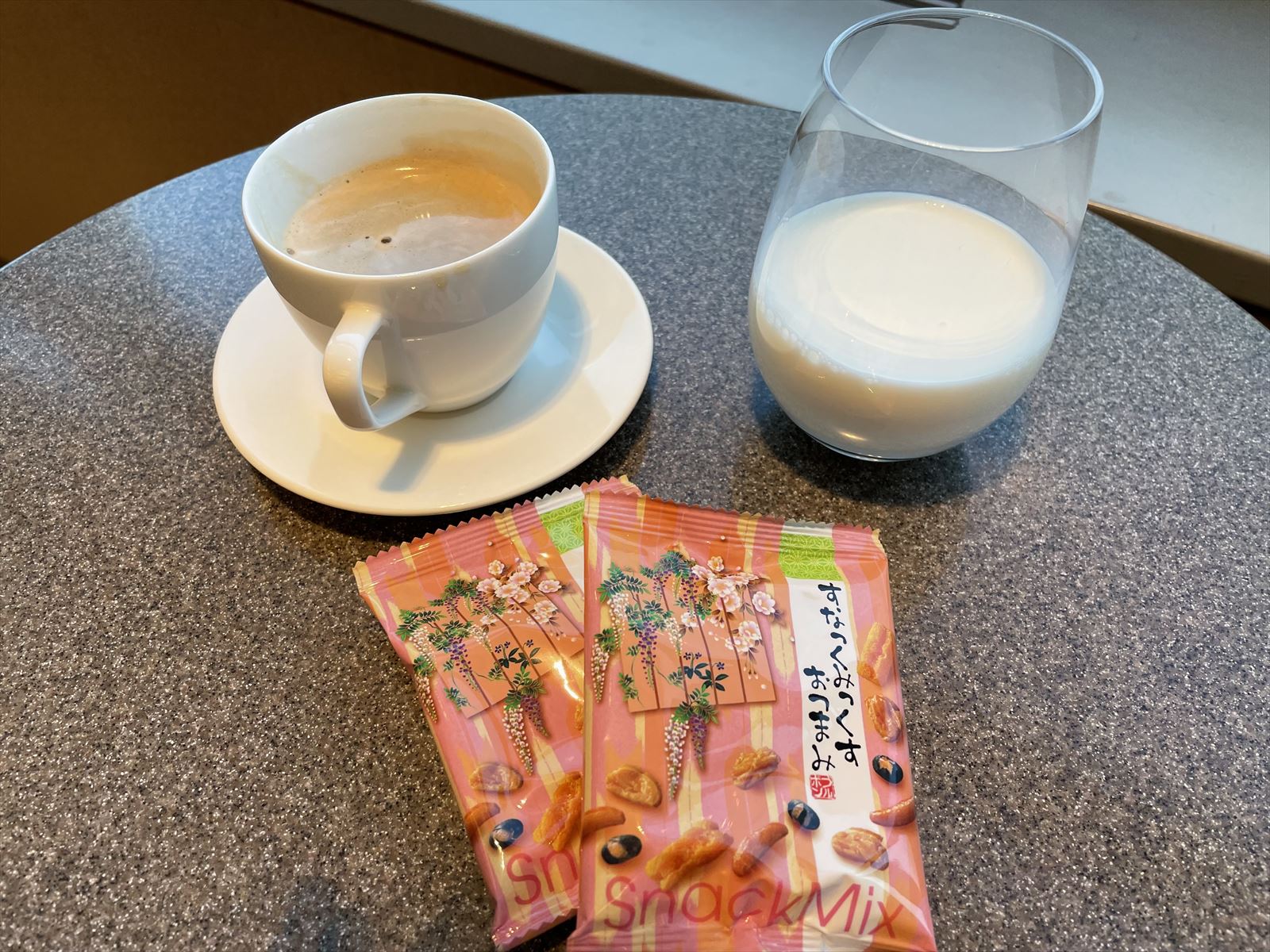 その後「条件付きー着陸できなければ羽田に引き返す」で飛ぶことが決まり、無事チェックイン。ラウンジに入ることができました・・・が、東京都に出されている「まん防」の影響で、朝の時間のアルコール提供はお休みでした。