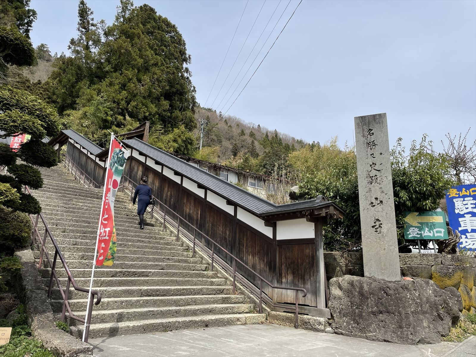 山寺の参道は、階段状になっていて、さらに手すりもついています。そしてときどき「登山口から○○段」という案内板があります。この表示があるおかげでへこたれそうになる気持ちを立て直すことができます。それに階段の両側に広がる景色は、ここでしか見れないもの。景色を楽しみながらゆっくり登ればシニアでも十分のぼれます。