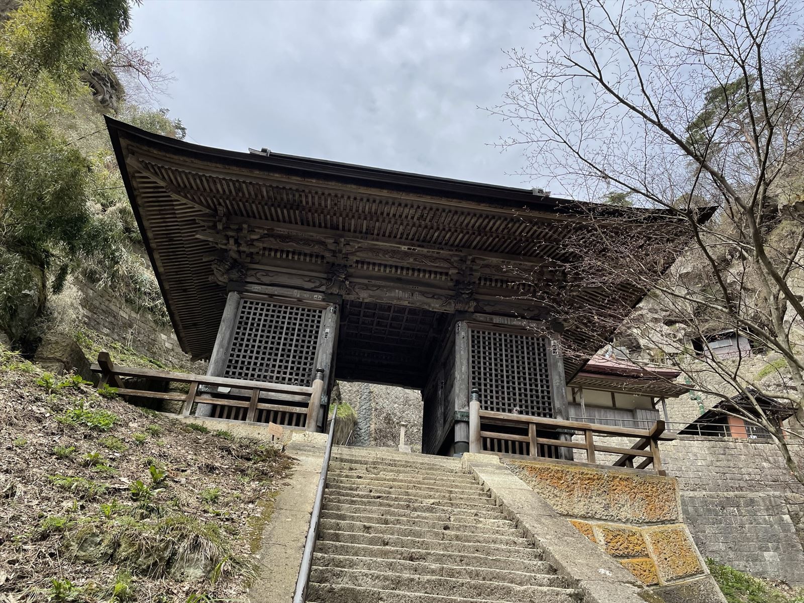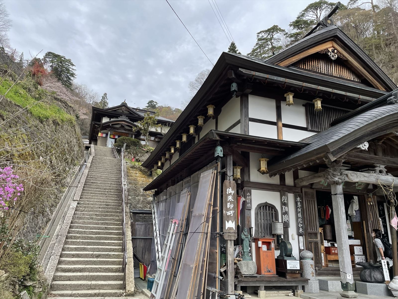 登山口と書かれた看板の階段を上ります。この階段を上った所に根本中堂があります。そこから山門に向かって歩きます。山門では拝観料金、大人300円を支払います。