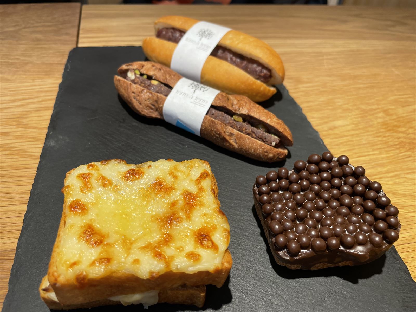 注文したのは、奥からあんバター 264円、ショコラ オランジェ363円、パールクラッカン 264円、クロックムッシュ 352円です。パールクラッカンは、このお店で特に人気の高い商品です。