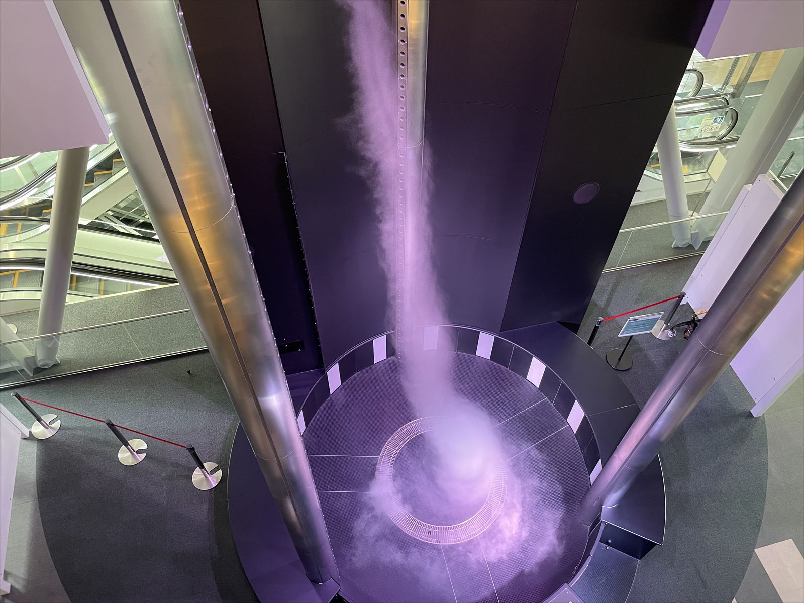 人工的に竜巻そっくりの空気の渦をつくり出すことができる実験装置です。高さ9mの空気の渦を見ることができます。4階から見るとさらに渦がよりはっきり見えます。