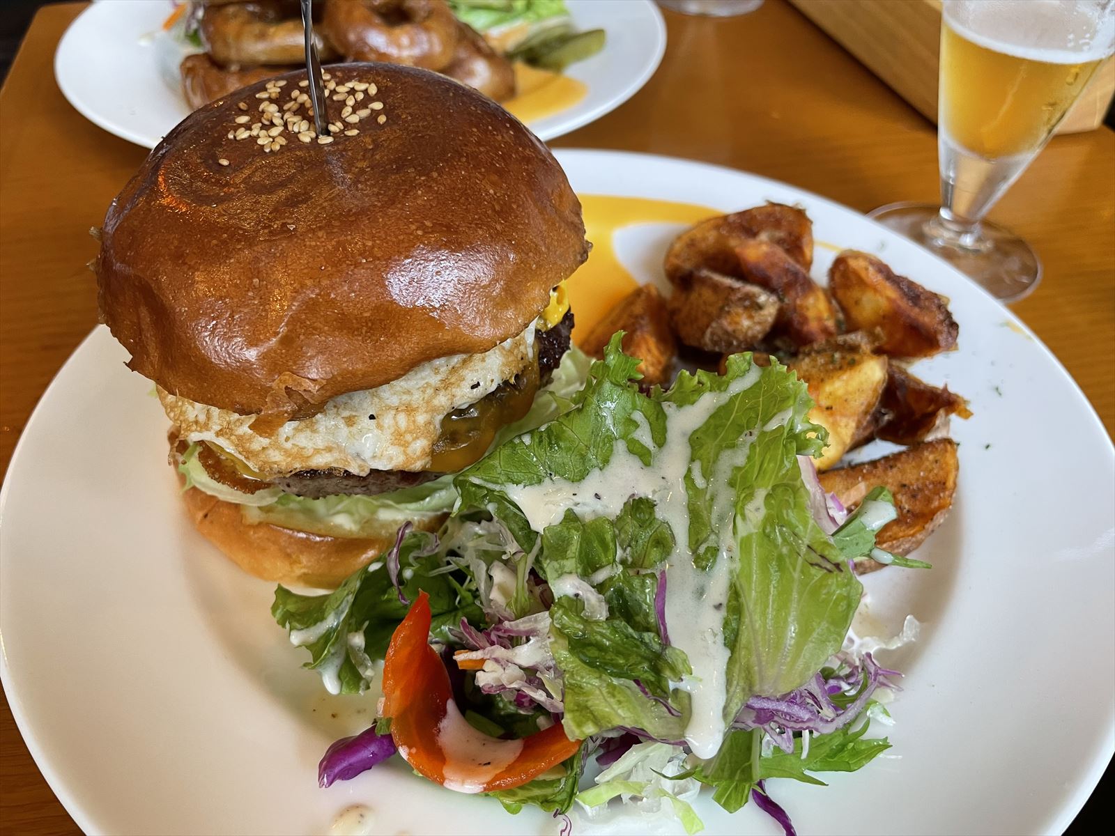 ハンバーガー、ポテトorオニオンリング、サラダ、ドリンク付き