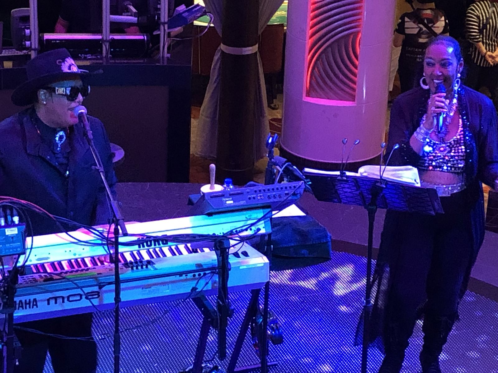 夕食の予約時間までに少し時間があったので、バー360に行きました。ここは、丸いステージを囲むようにバーのカウンターと席があります。このステージでは、歌やアクロバットのショーが行われていて、飲み物を注文しなくても、周りや吹き抜けになっている7階、8階から見ることができます。