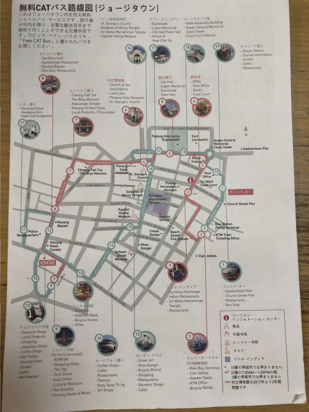 ・ペナンのジョージタウンは、町が小さいので歩いて観光できます。日本語の観光案内が無料で手に入るのもうれしいです。また、無料バスは観光客でも利用できるので、観光に便利です。この日はお天気が良かったので、暑いし、日差しが強かったです。帽子があった方がいいです。