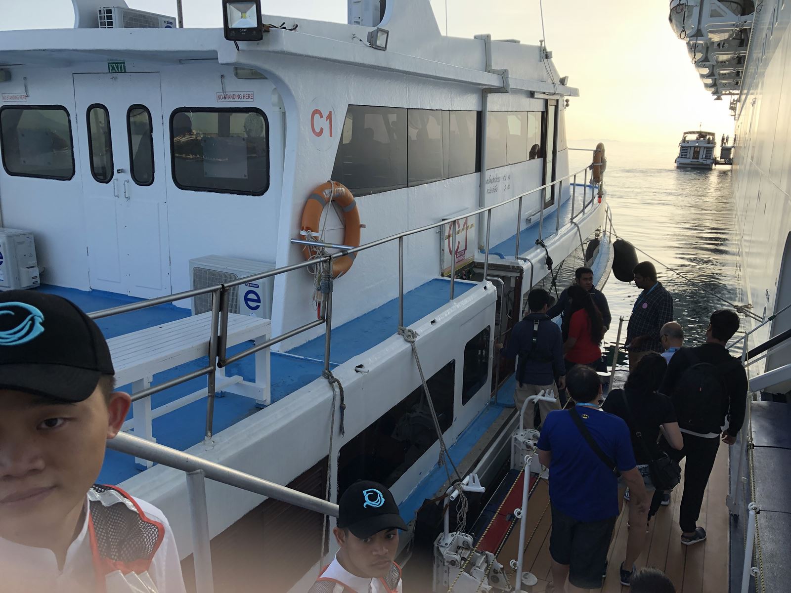 港では船のクルーが冷たいおしぼりとレモンティー、お水を準備してくれてました。来た順に並び、テンダーボートでゲンティンドリームに戻りました。