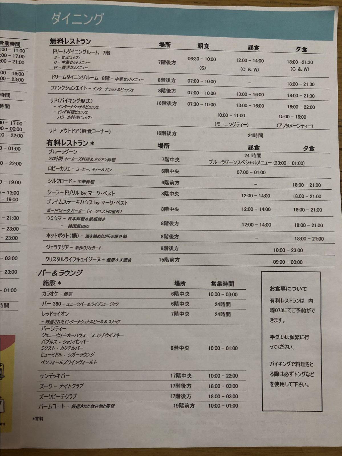 中華セットメニューか洋食セットメニューかを選び予約します。予約といっても、食べたい時間の少し前にドリームダイニングルームの入り口にいくと、係員さんがいて、人数とメニューを言うと入れる時間を紙に書いて渡してくれます。混んでいれば1時間位まちますが、この日は20分後でした。
