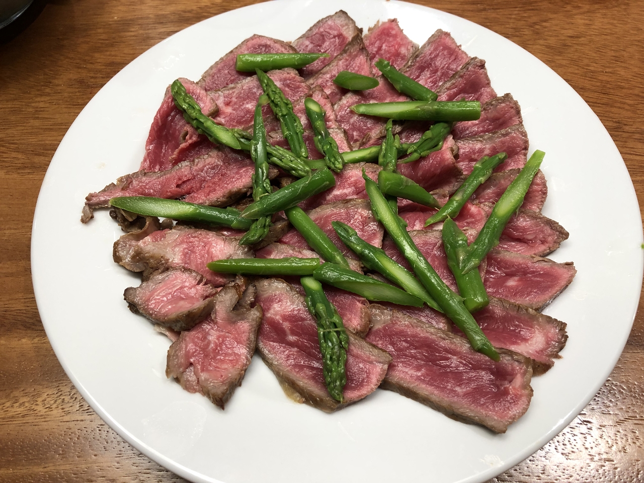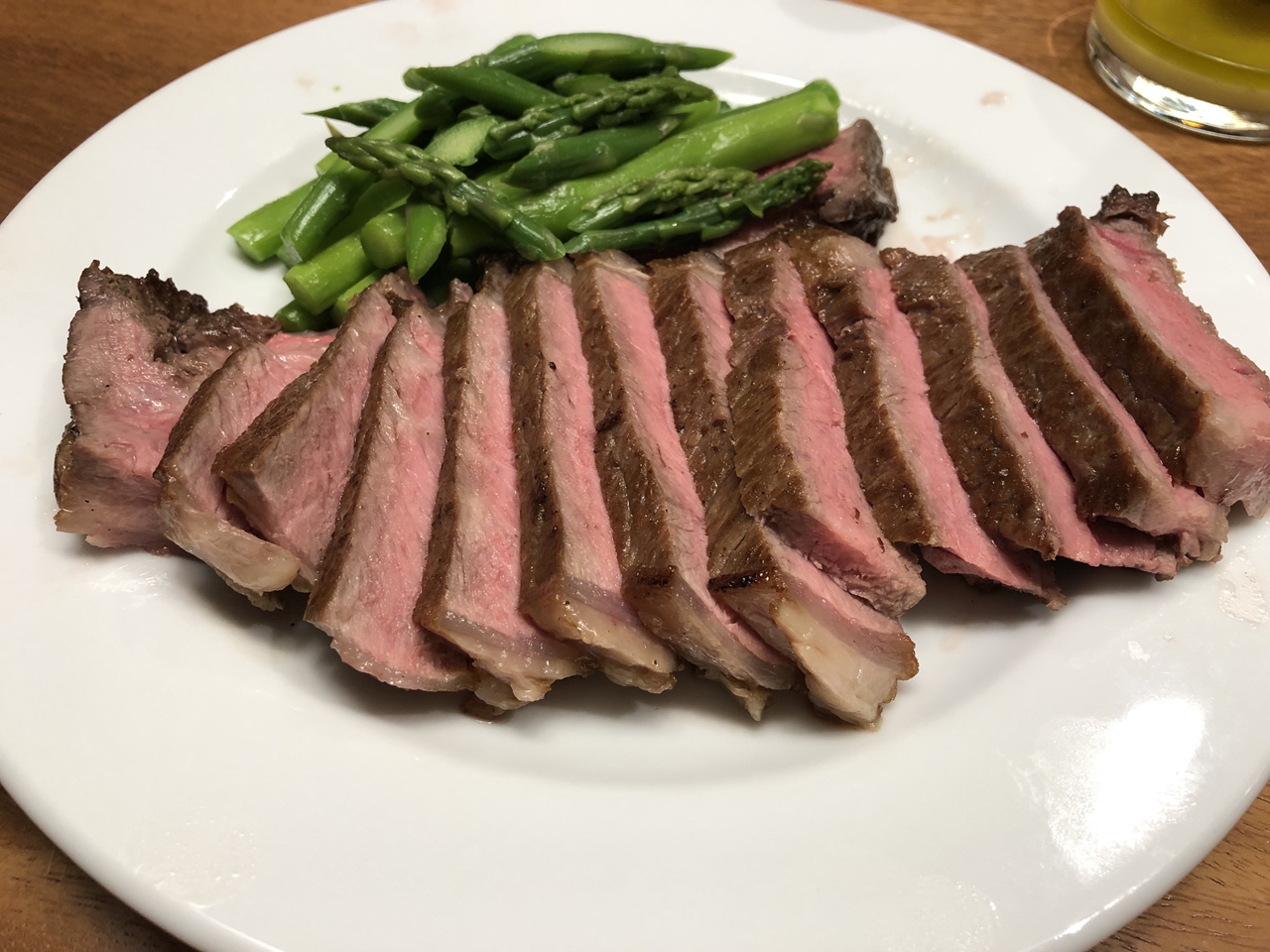 ・ホールフーズで買ったステーキ肉は美味しかったです。当然値段が違うのですが、前日のフードパントリーの肉とは違いました。いくら高い肉といっても1ポンド21.99ドル。2枚のステーキ肉で1.9ポンド(860g)で41.78ドル。4500円位でした。和牛の100g3000円とかいうのに比べれば安いです。さすがに2枚全部は食べきれず、たたきにした方は次の日に回しました。