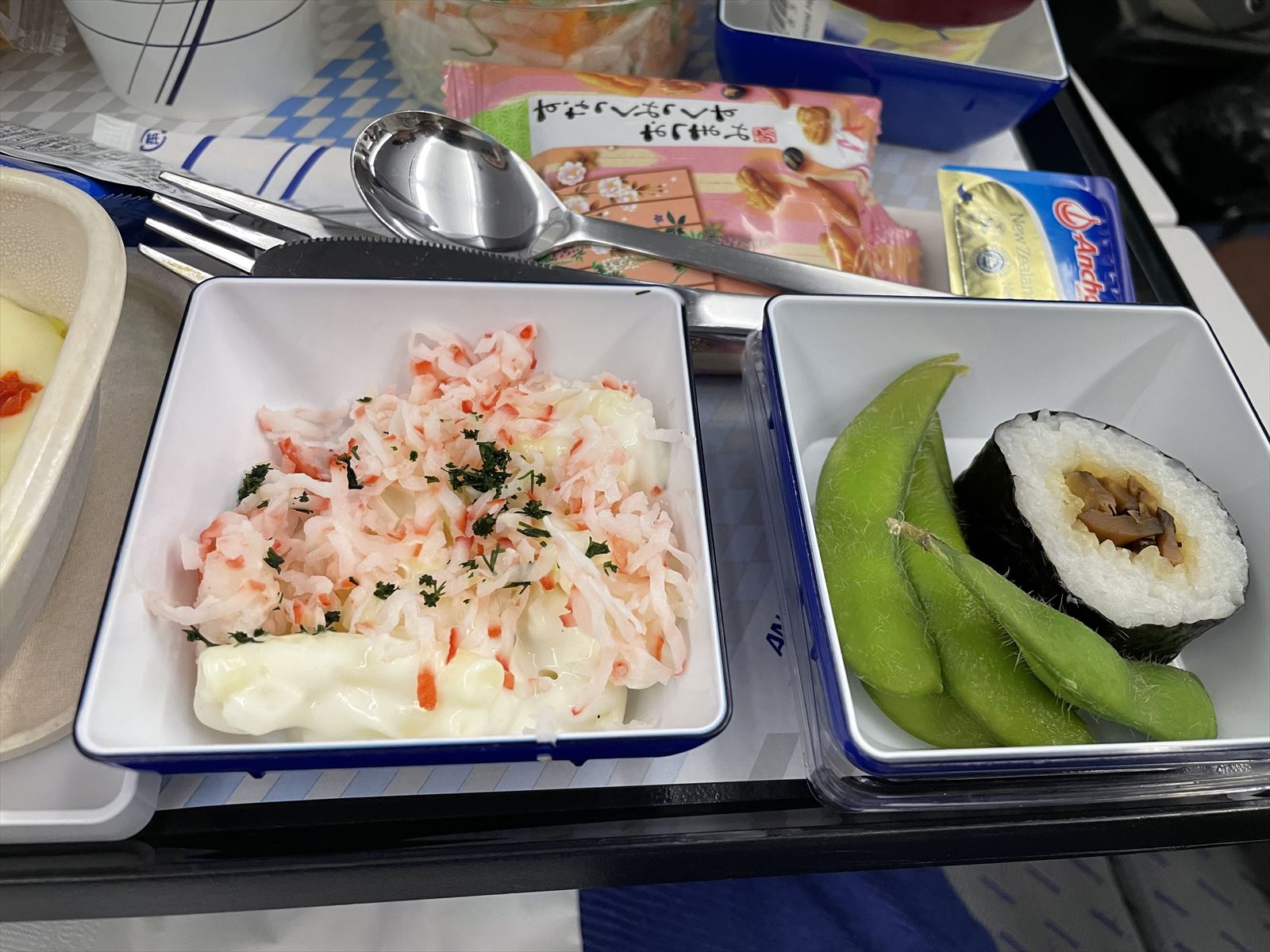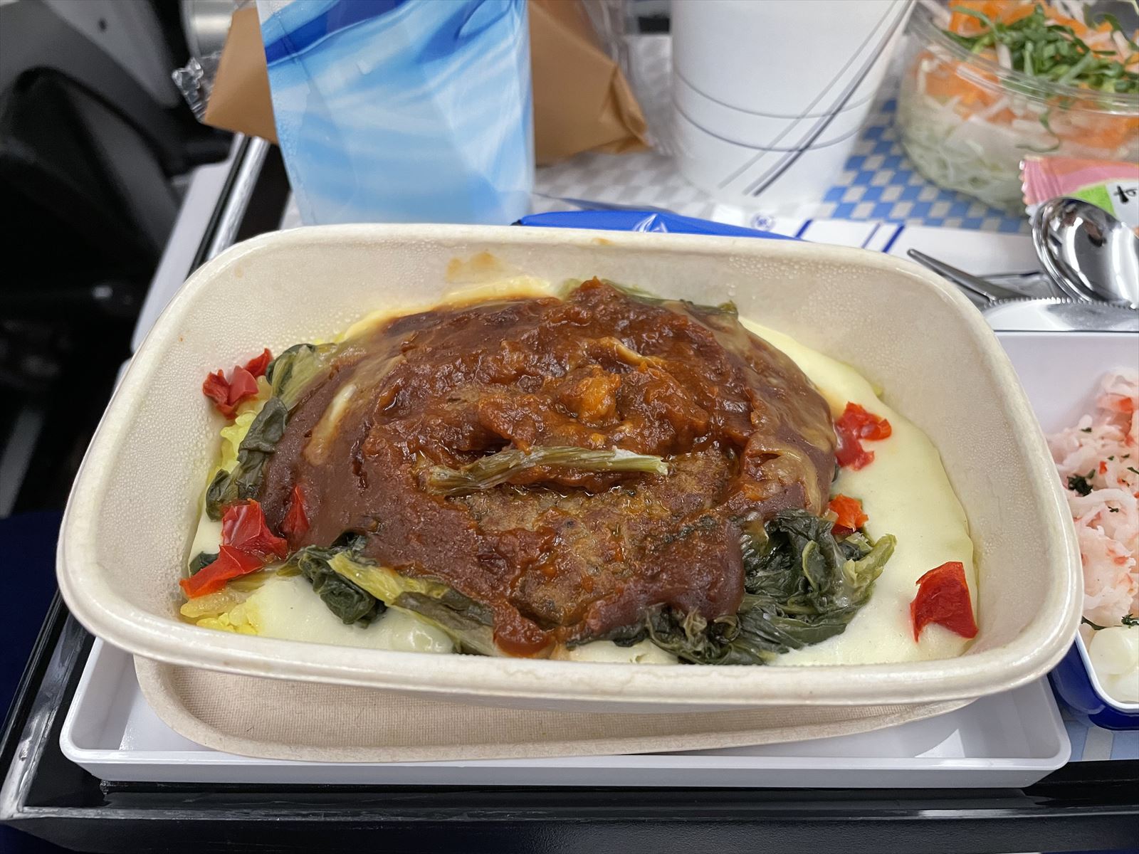 今回の機内食は「ハンバーグ デミグラスソース・マカロニサラダとカニカマ・中巻き・枝豆・ミックスサラダ・パン・クラッカー・チーズ・水・アイスクリーム」だったけど、メインのハンバーグに添えられているご飯が味がなくべっちゃりした感じ。中巻きと書いてある巻きずしのご飯はカッチカチ。どうやったらここまでマズイ巻きずしになるのか聞いてみたい。機内食の担当者は本当に試食して決めたんだろうか?と思ってしまいました。