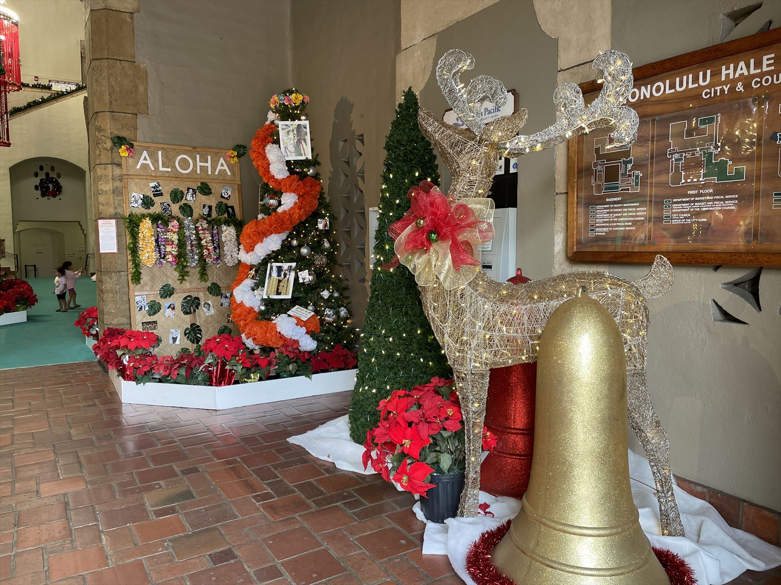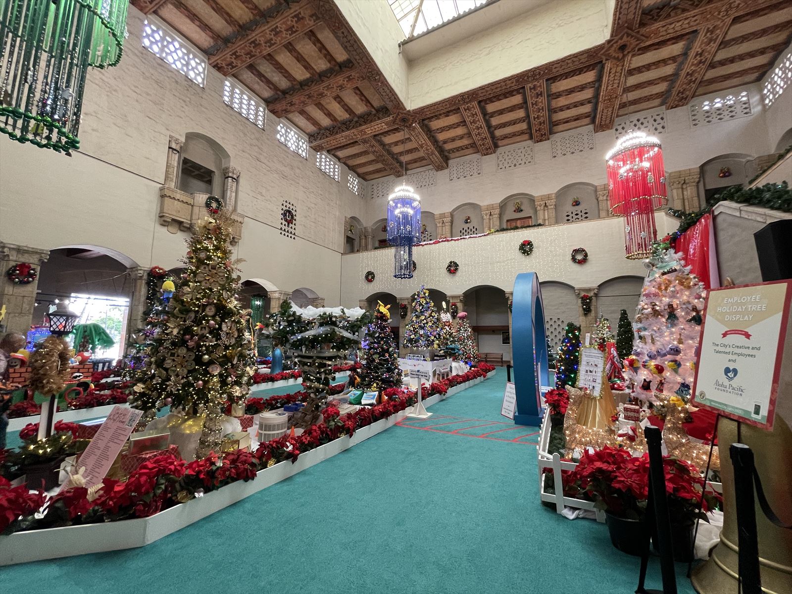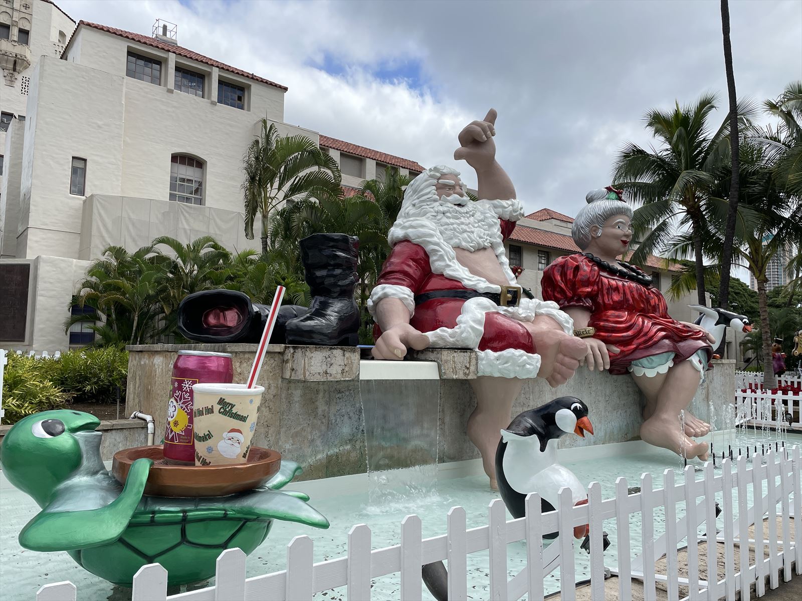 毎年楽しみにしている「ホノルル・シティ・ライツ」です。市庁舎内にはたくさんのクリスマスツリー、周辺の公園にはあちこちにクリスマスのオブジェが飾られます。本当は夜の方がイルミネーションが灯され、見応えがあるのですが、安全第一のシニア、明るいうちに観光します。