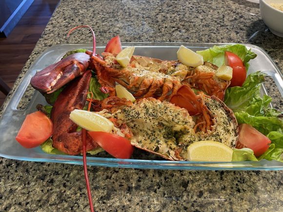 ロブスターは塩ゆでして、その後半分に切りオーブンで焼きました。