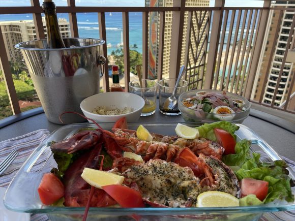 材料費1万円越えといっても、2人でレストランで食べたら1万円では済みません。ましてロブスターを注文したら軽く2万円(お酒も入れて)は超えてしまいそう。それにチップもいくらにするか、酔った頭で考えるのも面倒ってことで、自炊に満足しています。自炊と言っても作るのはオットですけどね。