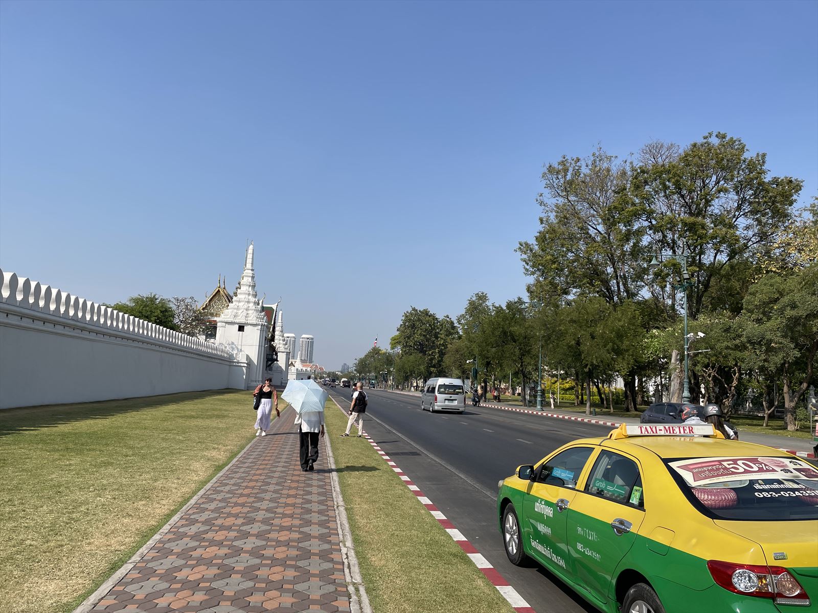 駅を降りて、サナームチャイ通りを歩いてい行くと、すぐワットポーがあります。でも遠い所から観光しようとワットプラケオを目指します。この通りには国防省や内務省、最高裁判所などがあり、ビルはないので落ち着いた雰囲気の通りです。