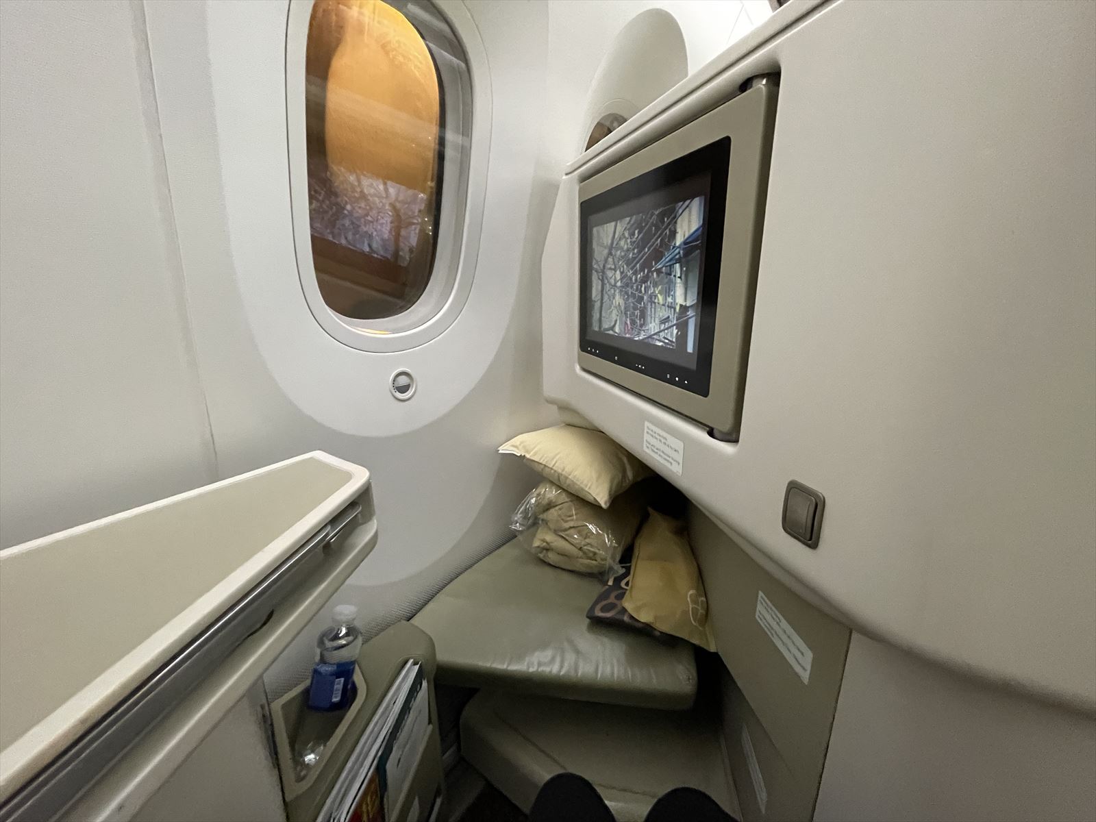 夜中の出発なので機内食はでません。すぐフルフラットにして寝ました。これがビジネスクラスの良さですよね。