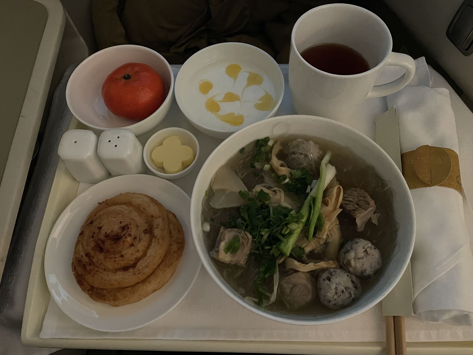 到着2時間前に機内が明るくなり、機内食にサービスが始まりました。