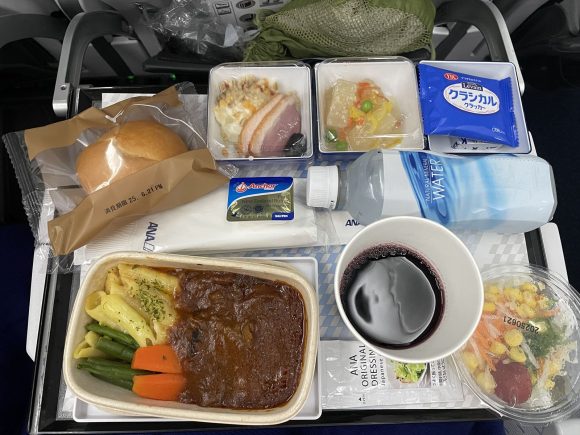 機内食は3か月ごとにメニューが更新されます。しかし前回が6月下旬、今回は8月下旬、だから同じメニューなんです。