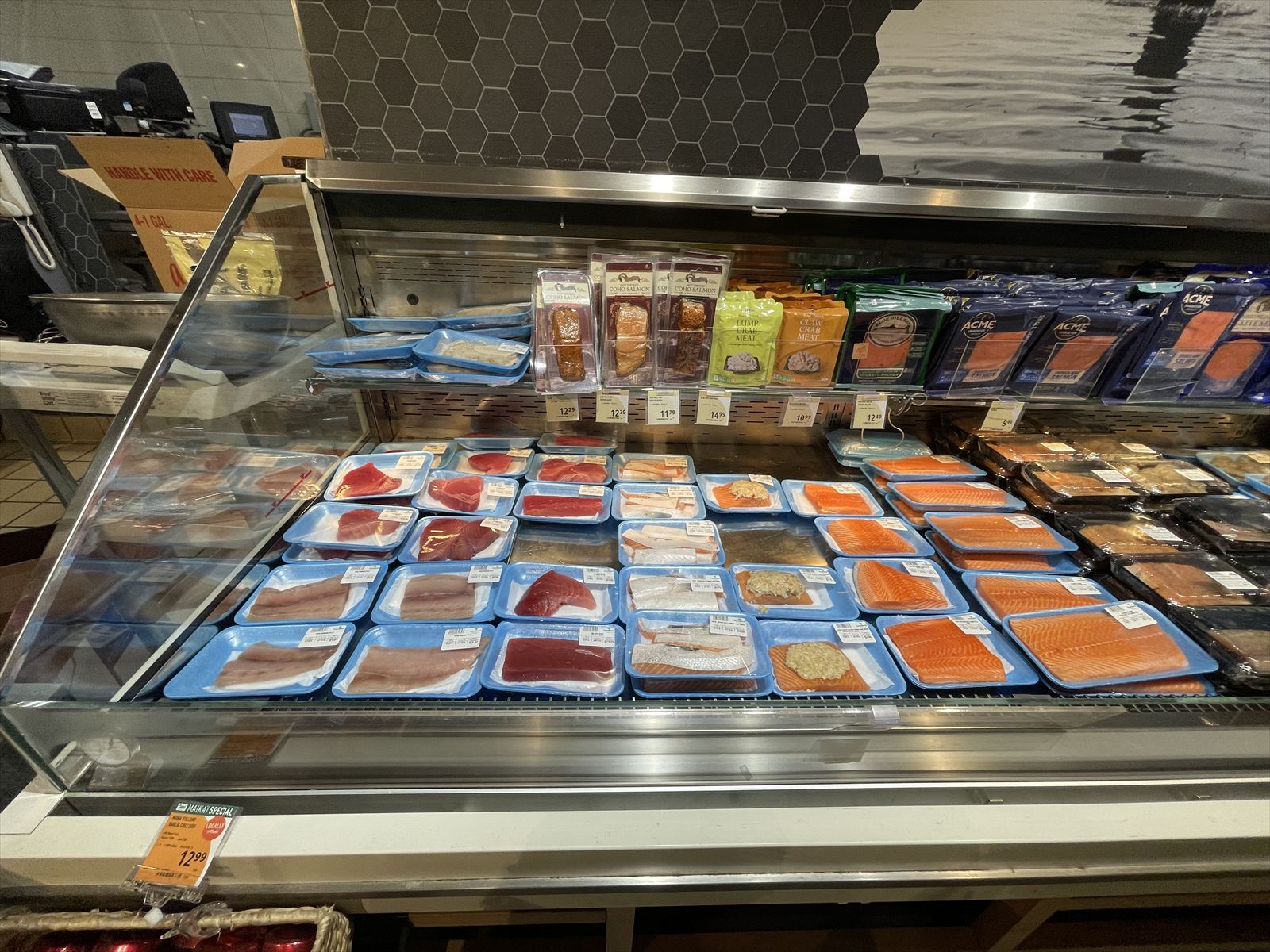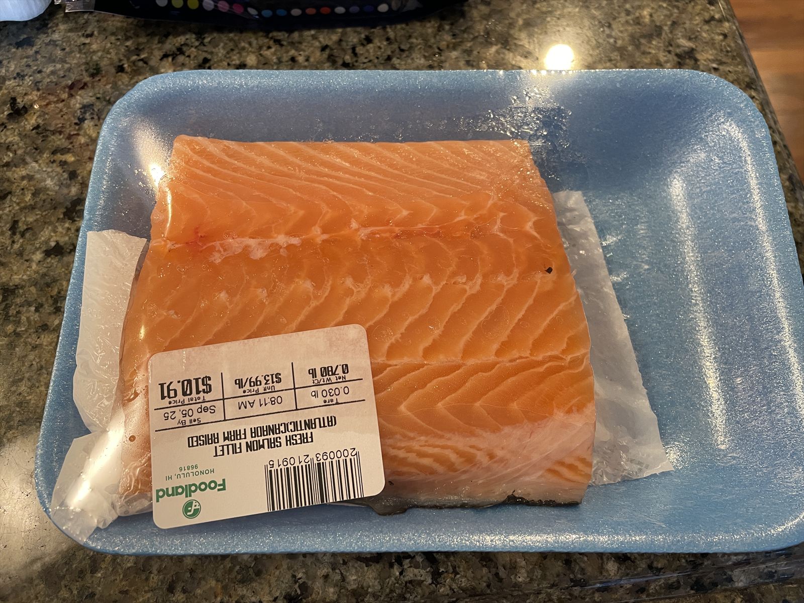 フードランドではこんな感じでトレイにのって魚が売ってます。購入したサーモンはこの大きさ(約350g)で10.91ドル(約1,670円 1ドル=153円で計算)でした。