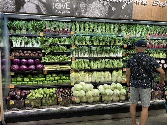 日本の野菜売り場とは違って、トレイにのってるものが少なく計り売りです。自炊には人参1本から買えるハワイの売り方が便利です。