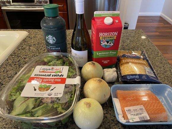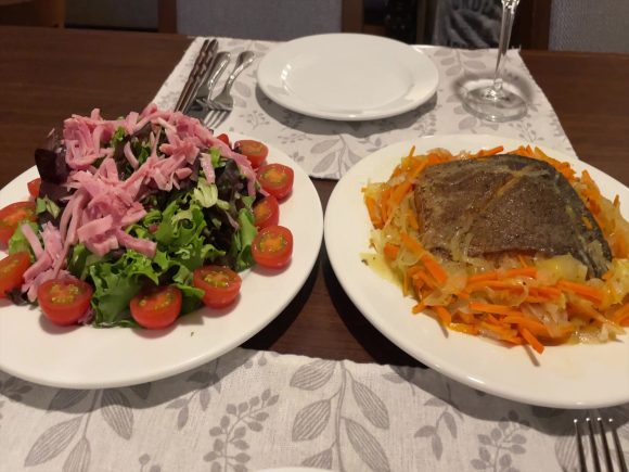 この日の夕食は、サーモンムニエル、サラダ、白ワインでした。