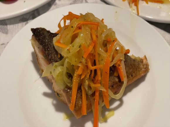 サーモンムニエルは、日本人ならお醤油をかけても十分美味しいですが、酸味を効かせた味付けのにんじんと玉ねぎを炒めたものと一緒に食べて、とても美味しかったです。