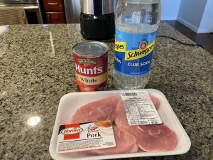 フードパントリーでは豚肉とトマトソース用にトマトの水煮、炭酸水を購入。パン粉や小麦粉は持ってきました。