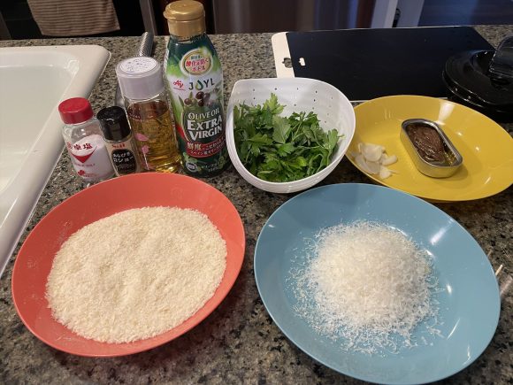 材料のパン粉にホールフーズで買ってきたパルメザンチーズを混ぜました。イタリアンパセリとアンチョビでグリーンソースを作ります。