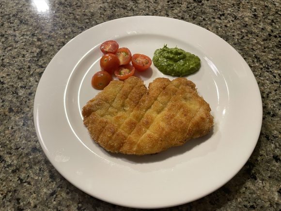日本のトンカツはソースをかけて食べますが、今回はグリーンソースでいただきます。トマトソースでも美味しいですよ。
