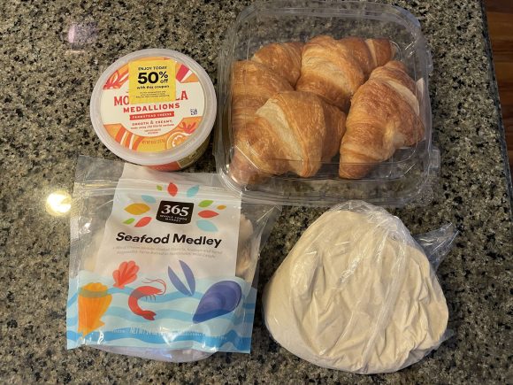早速ピザ生生地、モッツァレラチーズ(ハワイでも半額シール見つけました!)、シーフードミックス、そしてランチ用のクロワッサンを購入しました。