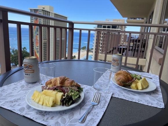 ワイキキアンに戻って、さっそくクロワッサンサンドイッチを作りました。前日買ったマウイゴールドも添えました。(昼食はツマの当番)。切って挟むだけの簡単調理ですが、これもどこかのカフェで食べたら10ドル以上しますよ。バカンス中ということで、昼からビールも飲んじゃう、最高のランチです。