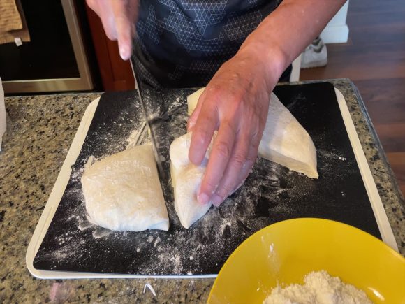 ホールフーズのピザ生地は、だいたい4枚分あります。生地を4等分して丸め、しばらく休ませ、その後薄くのばしていきます。でもホールフーズのピザ生地、ちょっと強力粉が多いのかなかなか薄くのびてくれません。今回麺棒を持ってこなかったのでちょっと大変でした。