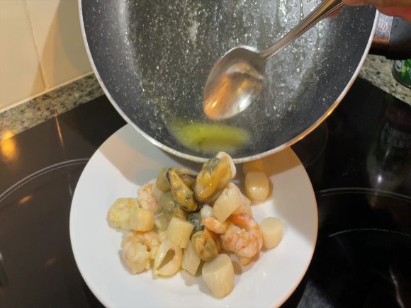 生地を休ませてる間に具材の用意をします。今回はシーフード。オリーブオイルで炒め、塩コショウします。ハワイの冷凍食品は量が多くてなかなか手がでないのですがホールフーズには小さいサイズがあります。これで半分くらいつかいました。