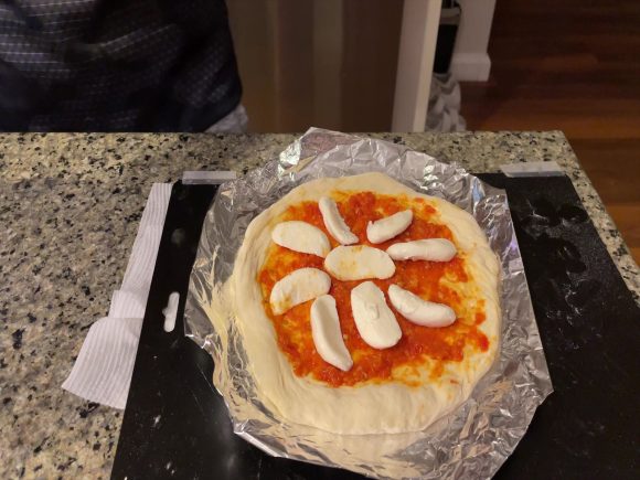 生地を延ばし、1枚はマルゲリータ。トマトソースを広げ、モッツァレラチーズをのせます。