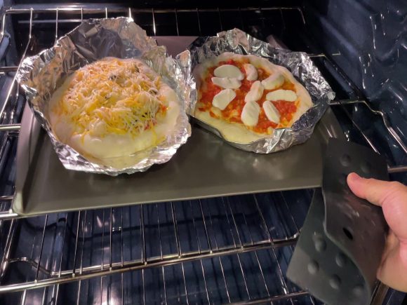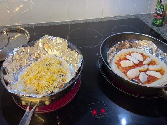 本来ならこのままオーブンで焼くのですが、生地が薄くのびなかったで、フライパンで下面を加熱しました。これをすることで厚目のピザも生焼けを防げます。シーフードの方はサラダなどに使ってるチーズをのせ、味の変化も楽しみます。