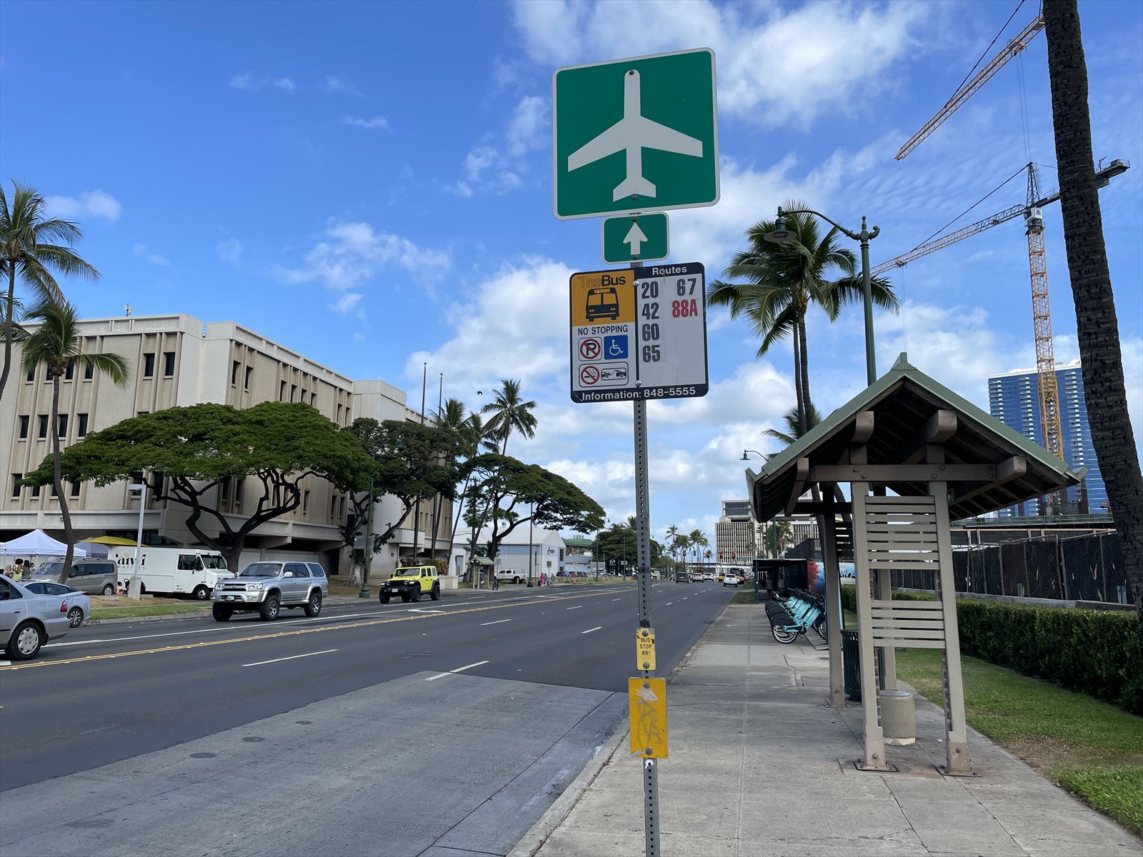 朝、ワイキキアン近くのバス停から20番か42番に乗ればカカアコに行けます。降りるのは「Ala Moana Bl + Ward Ave」です。